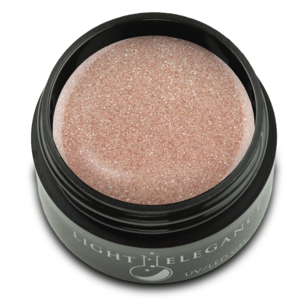 Un glitter color dorado rosa claro brillante con detalles en blanco mate. La combinación de brillo y mate crea un rosa salmón neutro, impactante y sofisticado.
